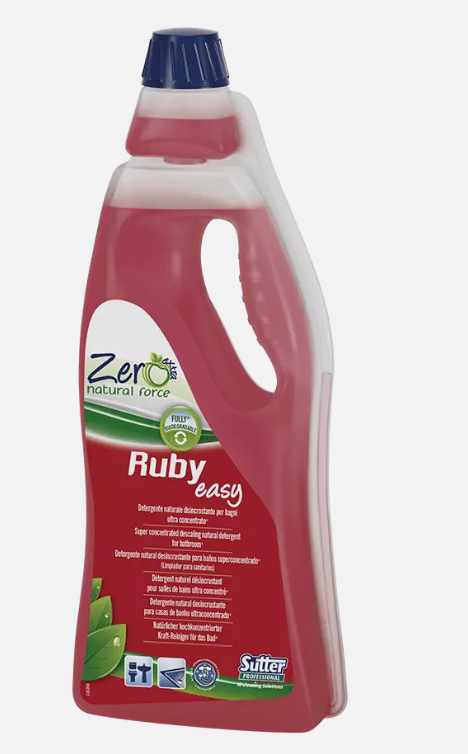 The daily usage of Ruby Easy, thanks to anti-redeposition agents, helps prevent scaling. It contains vegetal origin raw materials (e.g. surfactants, acids, solvents) coming from the processing sugar beet and coconut oil. Apple vinegar scent , allergen-free (Reg. 648/2004). Phosphate and nickel-free (less than 0.01 ppm). Allergen-free (Reg. 648/2004). Phosphate and nickel-free (less than 0.01 ppm).